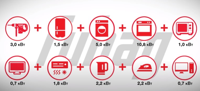 При расчете для приборов с электродвигателем (инструмента, холодильника, стиральной машины и др. приборов) учитывается пусковая мощность, т.к. у них пусковой ток выше номинального, что связано с особенностями работы электромоторов. Это означает, что для нормальной работы генератора при пуске указанных приборов, мощность должна быть выше.